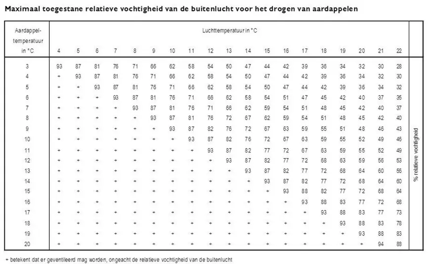 Het dauwpunt is de temperatuur waarbij de lucht met waterdamp verzadigd is. Als het dauwpunt van de lucht buiten hoger is dan de temperatuur in de aardappelbewaring kun je niet drogen. Het actuele dauwpunt kun je op veel plekken vinden (bv. onweerradar.nl). Het dauwpunt over een gemiddelde dag varieert, maar heeft minder variatie dan de buitentemperatuur. Basisregel is dat buitenlucht die kouder is dan de aardappelen altijd drogend is. Het nadeel van het toepassen van dit systeem is dat de aardappelen snel in temperatuur dalen. Gebruik van het dauwpunt geeft meer zekerheid in het behouden van droogmogelijkheden. Lees meer over bewaring o.a.: Teelthandleiding consumptieaardappelen - bewaring op www.kennisakker.nl.