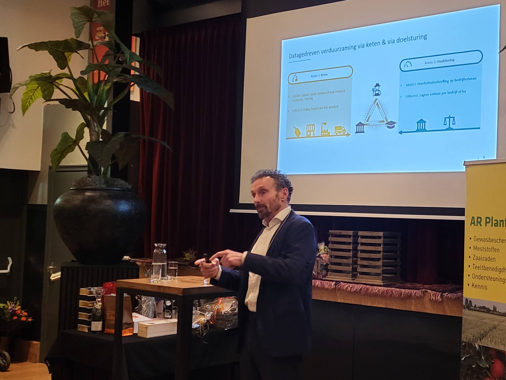 De bijeenkomst werd geopend door Pierre Berntsen, directeur agrarische bedrijven bij ABN AMRO. In zijn presentatie schetste hij hoe Nederland in de afgelopen decennia is uitgegroeid tot een internationaal gidsland in agrifood. Tegelijkertijd staat die positie onder druk door toenemende regelgeving, maatschappelijke verwachtingen en Europese dossiers zoals Natura 2000, de nitraatrichtlijn, klimaatdoelen en CSRD. Volgens Berntsen ligt de sleutel in gerichte verduurzaming, zowel in de keten als op bedrijfsniveau. Hij riep ondernemers, overheid en kennisinstellingen op om hierin gezamenlijk op te trekken. Zijn kernboodschap vatte hij samen met de woorden: “De enige constante in de agrarische sector is verandering en juist daarin ligt de kracht van Nederland.”