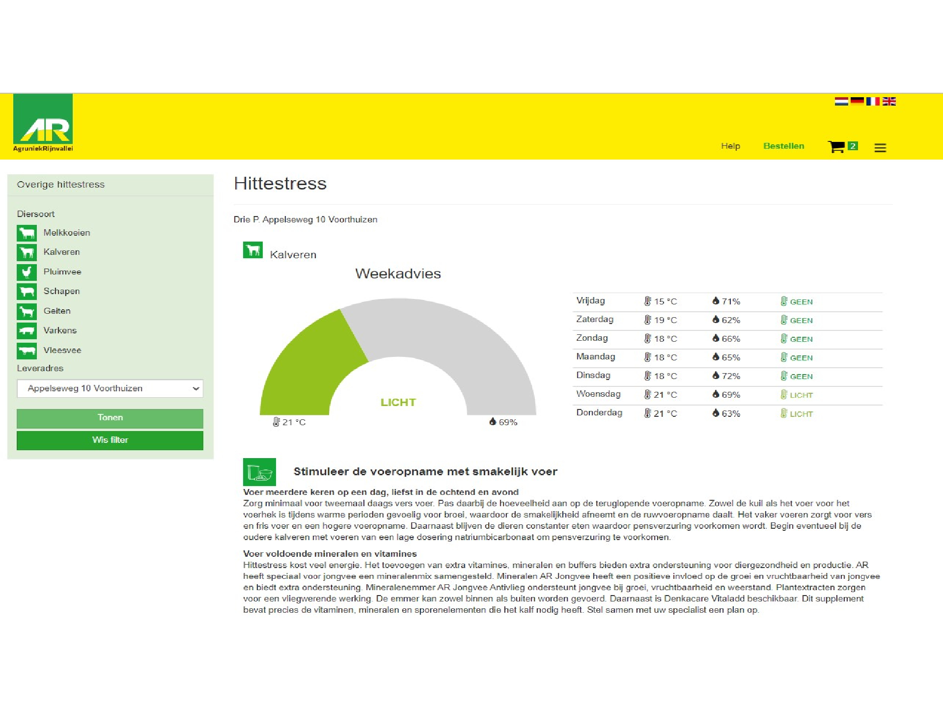 Het weekadvies is gebaseerd op het hoogste hittestressniveau in die week. Op het startscherm wordt de hittestress getoond van de diersoort met de meeste omzet. Wanneer je hierop klikt ga je naar de hittestresspagina en kan je ook de hittestressadviezen van de andere diersoorten en de andere afleveradressen bekijken. Via het menu kun je ook naar de hittestresspagina gaan.