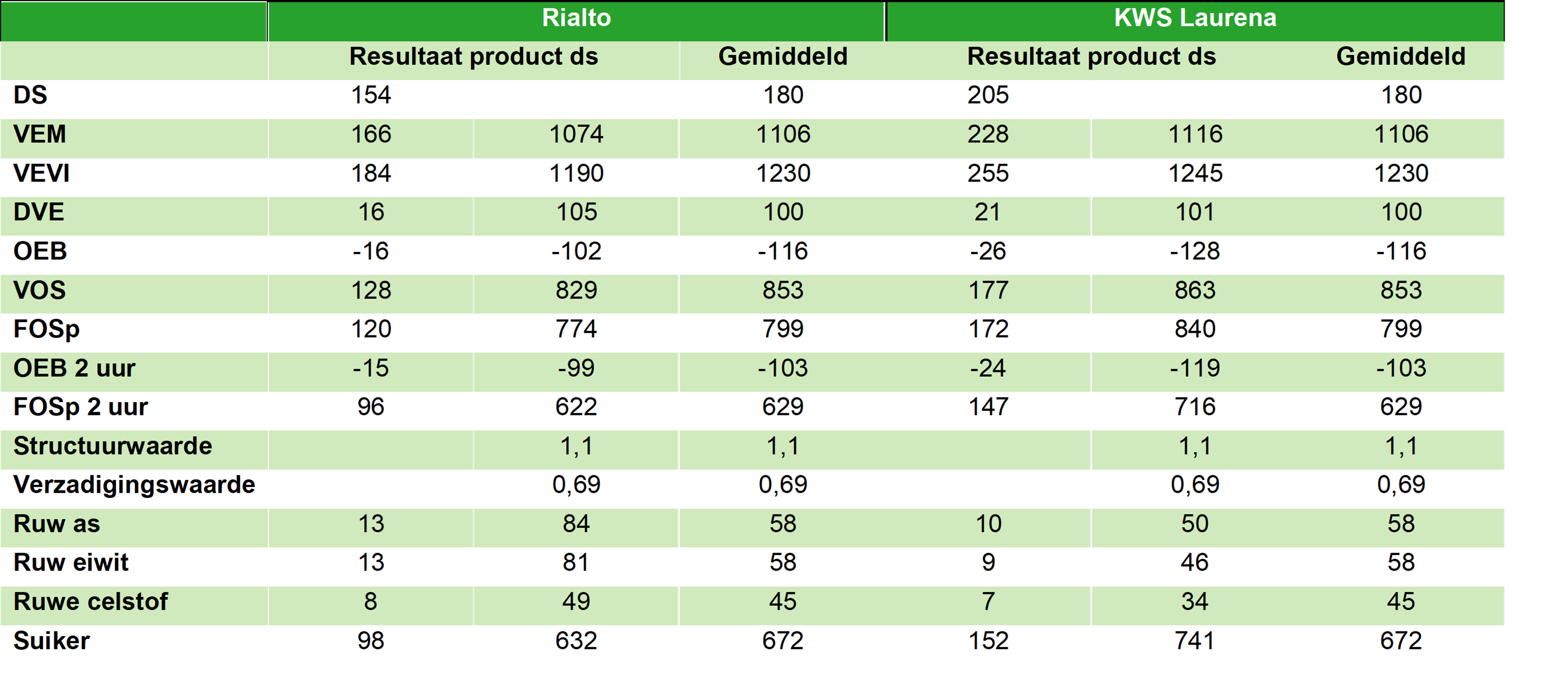 In de onderstaande tabel staat de voederwaarde van voederbieten van 2 rassen. Het zijn hoge VEM- en DVE-opbrengsten. De hoge VEM komt vooral het suikergehalte en de hoge DVE vooral door de negatieve OEB. Dit is de voederwaarde van verse voederbieten. Dit betreft verse bieten. Bij inkuilen worden de suikers omgezet in melkzuur.