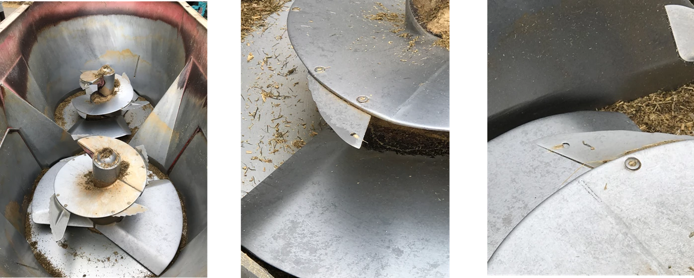Voor een goed rendement van de voermengwagen is regelmatig schoonspuiten de belangrijkste klus. Het gaat dan vooral om de binnenkant van de wagen. Wat vaak direct opvalt zijn de voerresten die boven in de voermengwagen ophopen (afbeelding 1), maar ook onder de vijzel(s) en in de hoeken bij de klep voor het uitladen van het voer bevinden zich voerresten (afbeelding 2). Wanneer de voermengwagen niet regelmatig wordt schoongemaakt, ontstaan er broedplekken voor gisten en schimmels die mycotoxines vormen.