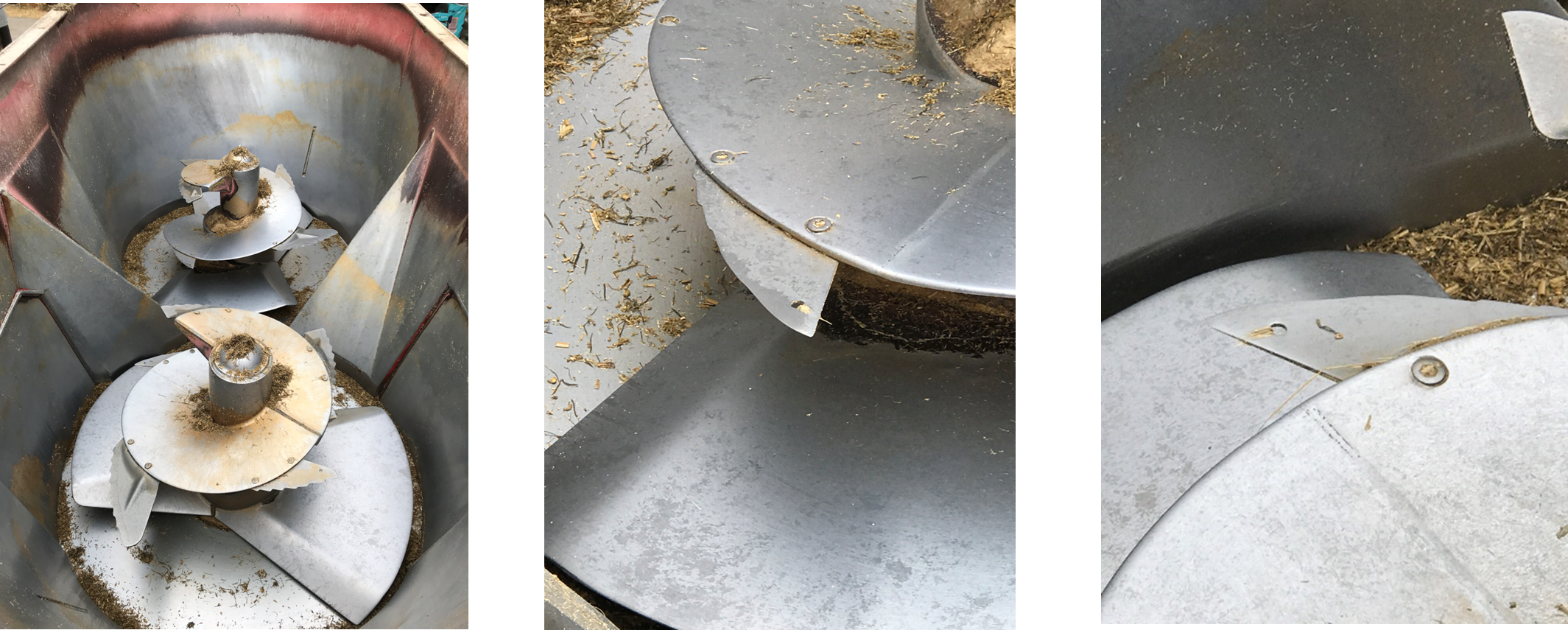 Voor een goed rendement van de voermengwagen is regelmatig schoonspuiten de belangrijkste klus. Het gaat dan vooral om de binnenkant van de wagen. Wat vaak direct opvalt zijn de voerresten die boven in de voermengwagen ophopen (afbeelding 1), maar ook onder de vijzel(s) en in de hoeken bij de klep voor het uitladen van het voer bevinden zich voerresten (afbeelding 2). Wanneer de voermengwagen niet regelmatig wordt schoongemaakt, ontstaan er broedplekken voor gisten en schimmels die mycotoxines vormen.