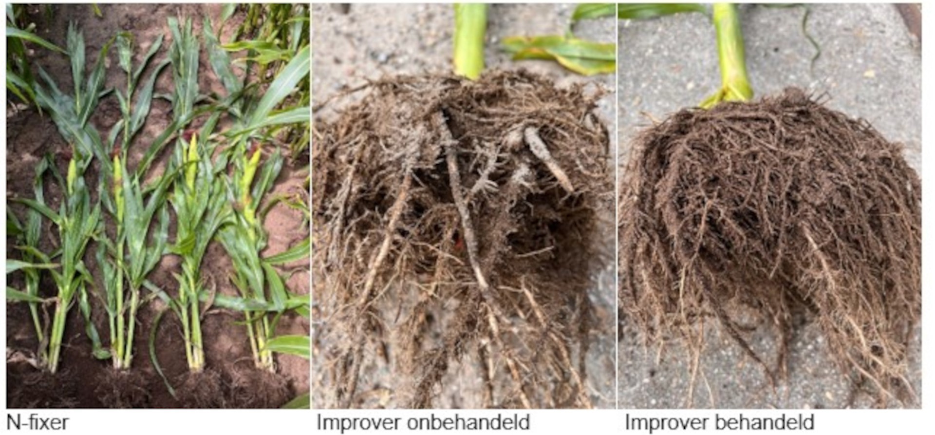 Onderstaande foto’s tonen aan wat we op dit moment in het veld zien. Bij N-fixer is dit voornamelijk de lengte en de massa, bij Improver zien we duidelijk beter ontwikkelde wortels en meer wortelharen.