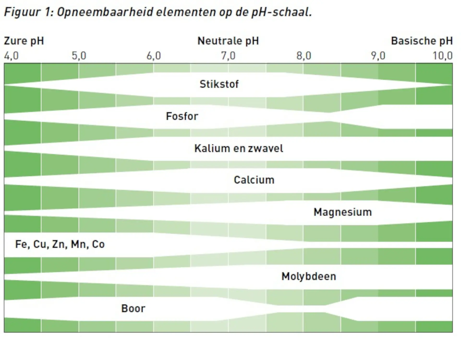 Naast een bodemverbeteraar is calcium een voedingselement voor de planten. Het zorgt ervoor dat de celwanden steviger zijn waardoor de plant minder last heeft van droogte, legering en plagen. Verder vergroot een bekalking de opneembaarheid van andere voedingselementen. Bij een te lage pH daalt de opneembaarheid van stikstof, fosfor, kalium, magnesium en zwavel (zie figuur 1). Het risico op mangaan-, aluminium- en ijzervergiftiging neemt toe. Dit beperkt de wortelontwikkeling en jeugdgroei van de plant wat leidt tot opbrengstverliezen. Vooral voor zuurgevoelige teelten zoals mais kan dit gevolgen hebben. Bij een zuur milieu bindt ijzer zich aan fosfor tot ijzerfosfaat. Hierdoor is de fosfor niet meer opneembaar voor de maisplant waardoor deze paars verkleurt. Dit betekent dus niet dat er onvoldoende fosfaat in de bodem is. Een bekalking om de pH te verhogen kan daardoor bij planten zoals mais een fosforgebrek verhelpen.