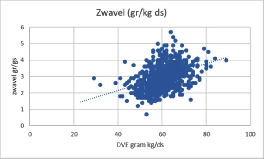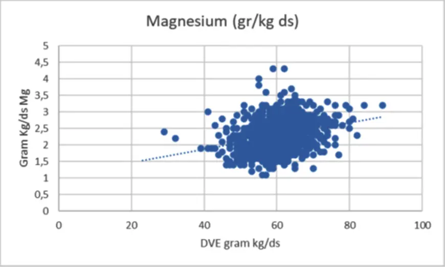 Zo is de bemesting voor het eiwitpercentage afhankelijk van het stikstof- en kaliumgehalte. De kwaliteit kan positief beïnvloed worden door bemesting met magnesium en zwavel. In de grafiek zie je het verband van onze kuiluitslagen ten opzichte van magnesium- en kaliumgehalten in de kuil.
