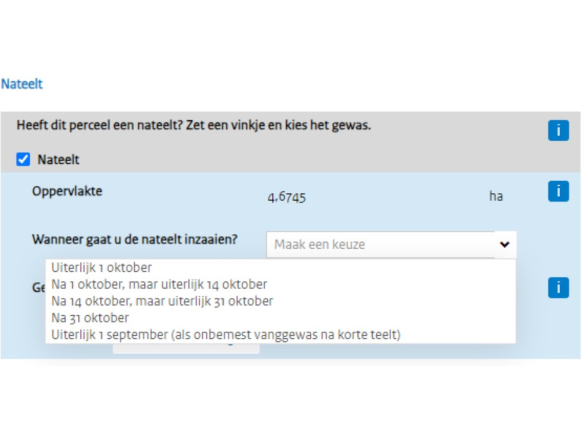 - Je kunt je percelen nog splitsen indien nodig. Dit kan gewenst zijn als je voor een gedeelte van een perceel in aanmerking komt voor de eco-activiteit ‘vroeg oogsten rooigewas’.