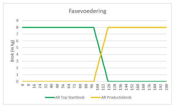 Om een maximale ondersteuning te bereiken is het de bedoeling de brok als fasevoedering in te zetten. Hierbij wordt in de eerste 100 dagen de AR Top Startbrok met max. 8 kg ingezet. Vervolgens wordt er in 20 dagen afgebouwd en overgegaan op een Productiebrok (zie onderstaande afbeelding).