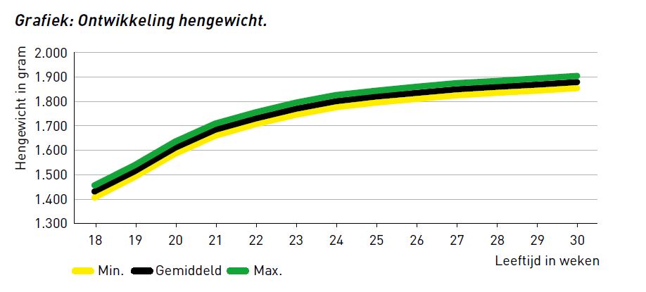 De specialisten van AR besteden veel aandacht aan het monitoren van het hengewicht. Door de jaren heen hebben we gezien dat bij jonge hennen het hengewicht belangrijker is dan de leeftijd bij het stimuleren van de eierproductie. De groei kan het beste behaald worden in de opstartfase van de leghennen, wanneer ze nog niet leggen. Als een hen nog niet legt kan deze makkelijk 80 gram in de week groeien bij een voeropname van 75-80 gram.