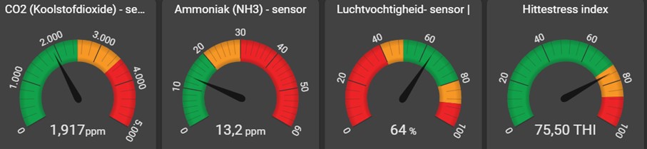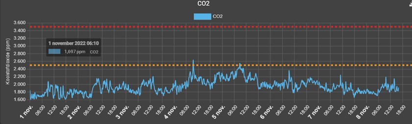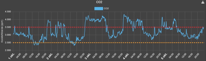 Een Slimme Stalmeter meet continu diverse waarden in een afdeling waaronder temperatuur en CO2. Hieronder staan de resultaten van een Slimme Stalmeter. Uit deze gegevens blijkt dat er te weinig wordt geventileerd: hoge begintemperatuur en een lange bandbreedte. Gevolg: CO2-waarde te hoog (periodes boven de 3.500 ppm).