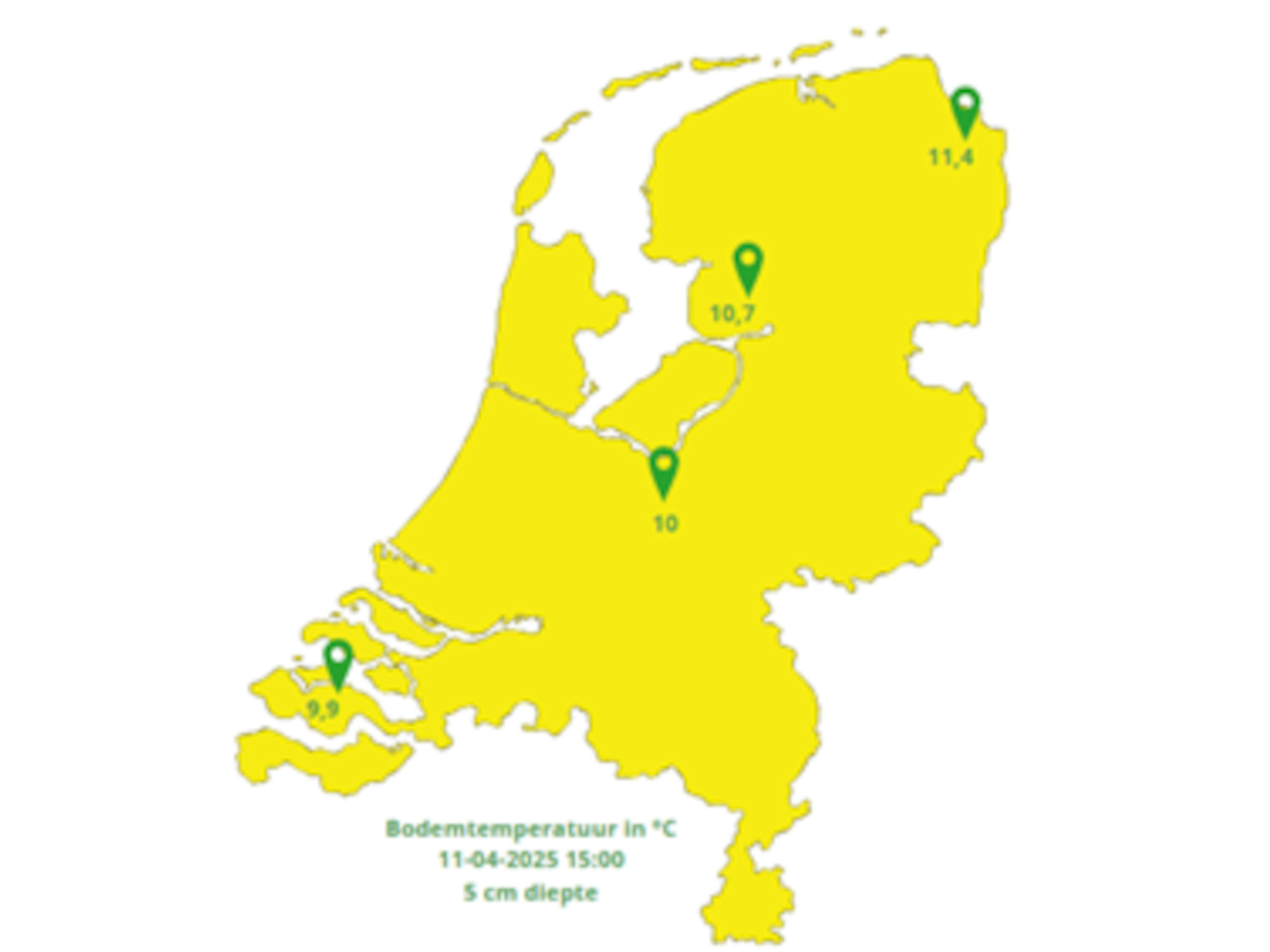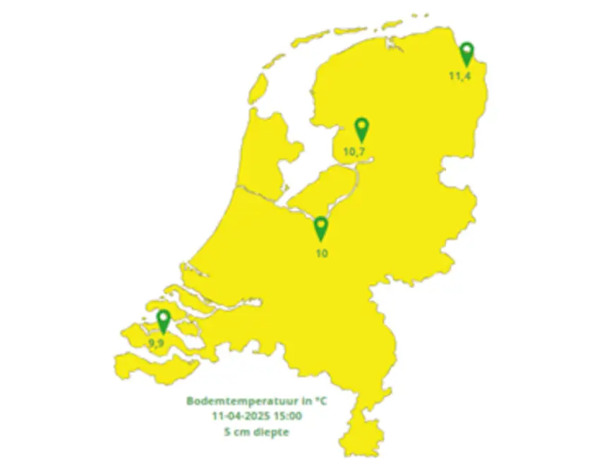 Toch is het belangrijk om te wachten op het juiste zaaimoment. In de afbeelding is de huidige bodemtemperatuur in Nederland te zien, op 5 cm diepte.
