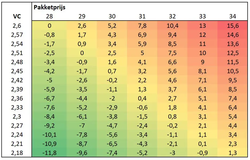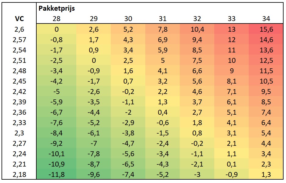 Het draait om de juiste balans tussen voerprijs en VC. Met de huidige genetica hebben vleesvarkens een hogere lysine per EW nodig. Geef je dat niet, dan benut je hun potentieel niet volledig. Dit uit zich in een lagere groei en een hogere VC. Een voer dat € 2,- per 100 kg duurder is, kan zich terugverdienen als de VC daalt. Wist je dat bij een pakketprijs van € 32,- en een VC van 2,18 de voerkosten per varken € 3,- lager zijn dan bij € 28,- en VC 2,60?