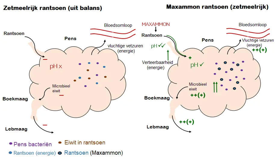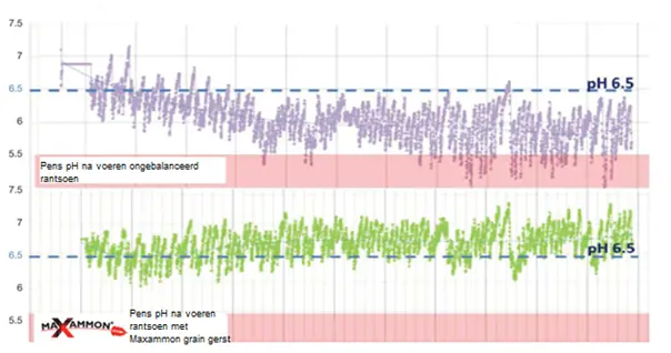 Maxammon grain gerst kan eiwitrijke grondstoffen (deels) vervangen in het rantsoen. Daarnaast kan Maxammon grain gerst andere krachtvoeders in rantsoenen vervangen. Doordat de pH hoger is kan er een hoger aandeel granen worden gevoerd. Daarnaast kan het prima ruwvoer vervangen wanneer de ruwvoerpositie in het geding is.