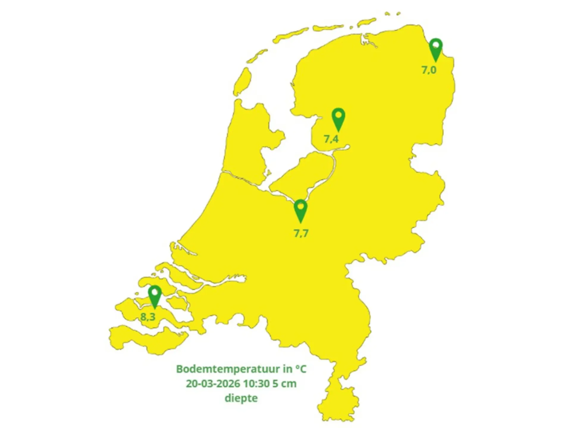 De T-som voor bemesten is inmiddels behaald en zit overal boven de 300. Dit laat zien dat er bemest kan worden als de omstandigheden het toelaten. De bodemtemperatuur is echter nog niet erg hoog, onderstaand het kaartje. Dit komt onder andere door de koude nachten.
