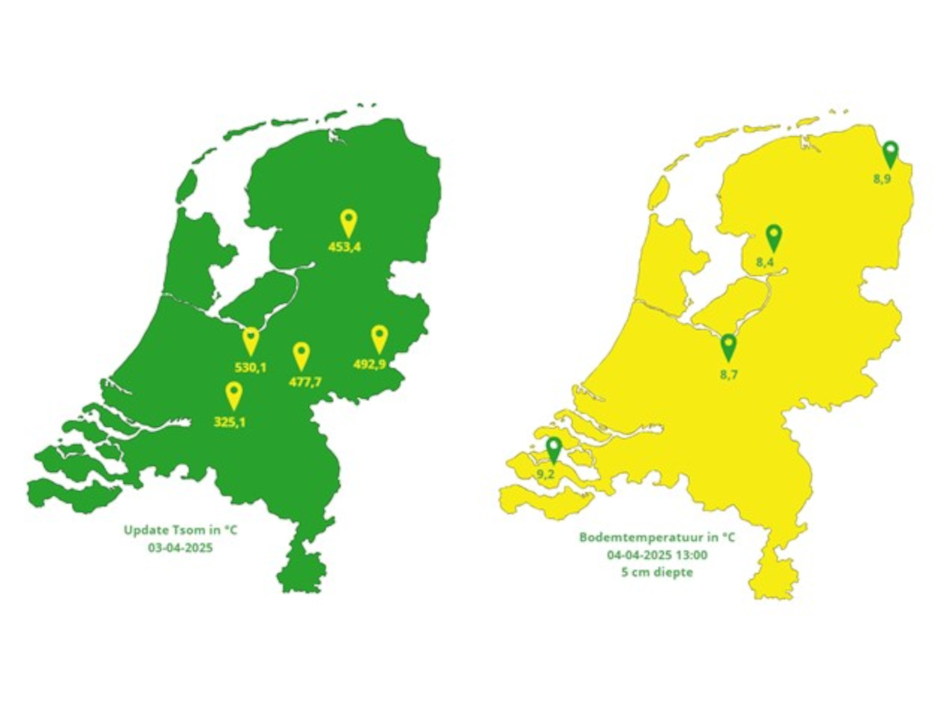 Ook de bodemtemperatuur is een belangrijke graadmeter voor het optimale bemestingstijdstip. Gras gaat pas groeien bij een bodemtemperatuur tussen de 5° en 8°C. Optimaal voor de groei is een bodemtemperatuur tussen 12° en 20°C. Neem dit mee in je beslissing als je de eerste kunstmest N gaat strooien. Inmiddels is de zaai van verschillende gewassen gestart. Voor gewassen als mais en bieten is de optimale bodemtemperatuur voor zaai rond de 10 °C.