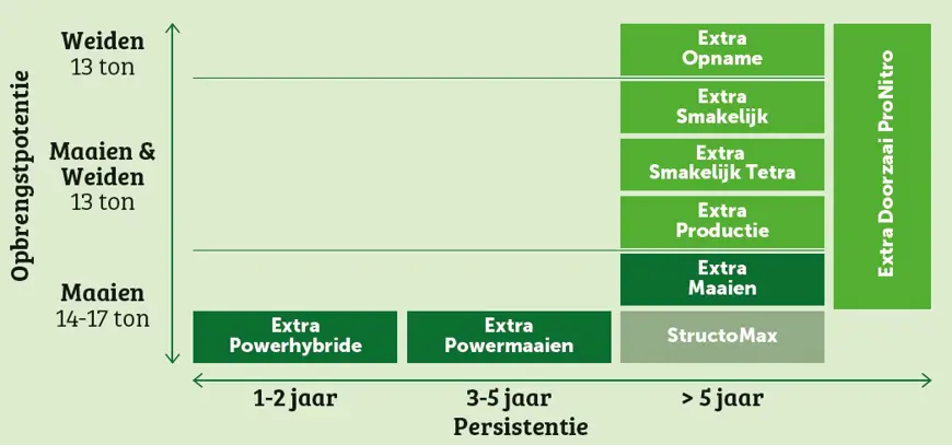 Welk mengsel je kiest én of je opnieuw gaat inzaaien hangt af van meerdere factoren. Bij opnieuw inzaaien profiteer je van de innovaties in het grassenkweekprogramma. Grasrassen verbeteren zich nog steeds op het gebied van eiwit, verteerbaarheid en voederwaarde. De figuur kan helpen bij het maken van de juiste keuze voor een grasmengsel.