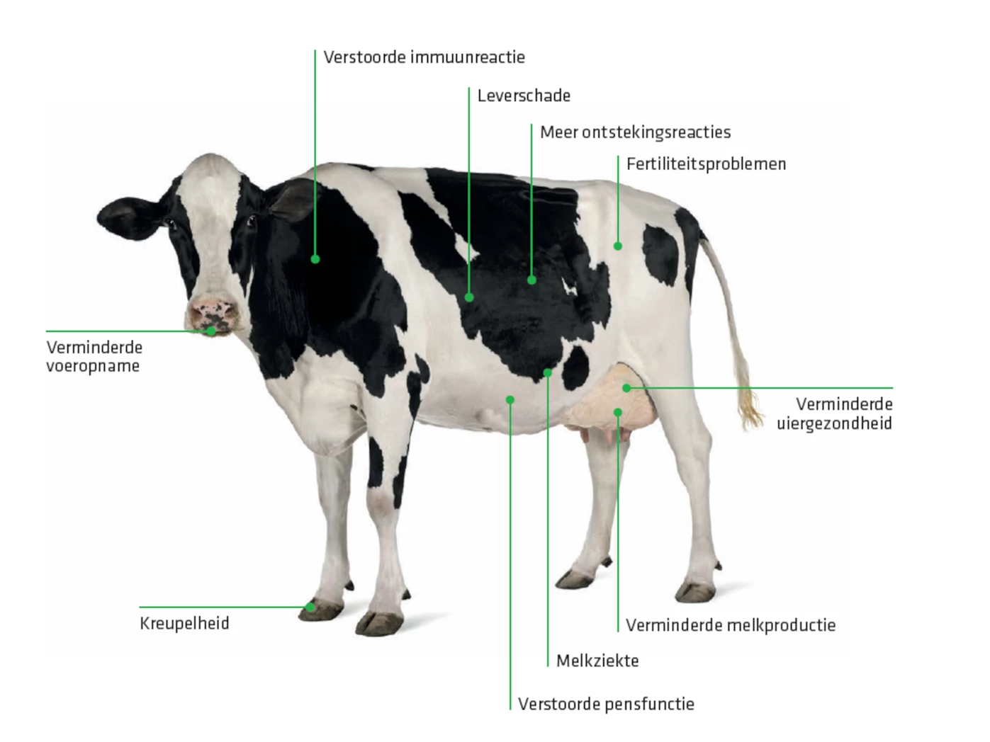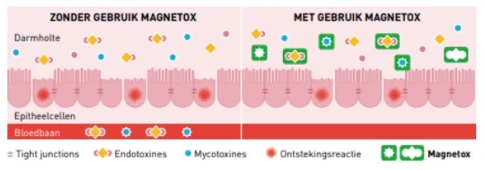 - Endotoxines zijn gifstoffen die vrijkomen wanneer een bacterie afsterft of zich vermenigvuldigt. De meeste endotoxines worden pas gevormd in het lichaam. De pens is hiervoor de grootste bron, omdat zich daarin veel bacteriën bevinden. Bij een gezonde koe is de permeabiliteit van de darm hoog. Die doorlaatbaarheid kan echter verhoogd worden door factoren zoals stress (bijvoorbeeld door hitte of rantsoenwisselingen), pathogenen en mycotoxines die de darmwand beschadigen. Endotoxines kunnen dan makkelijk het lichaam binnendringen. De toxines binden zich aan bacterieresten en waterdeeltjes waardoor ze zich gemakkelijk door het lichaam verspreiden en een reactie van het immuunsysteem opwekken.