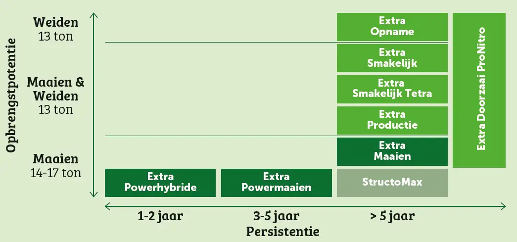 Bij de inzaai van een nieuw perceel is er een grote keuze in weidemengsels. Kies een mengsel dat het beste past bij de beoogde toepassing (weiden en/of maaien), de verwachte teeltduur en de voederwaarde (energie of eiwit). Het schema van de Extra Weidemengsels is daarvoor een hulpmiddel. Kies in elk geval een kwaliteitsmengsel; dat verdient zichzelf terug in opbrengst, kwaliteit en melkproductie.