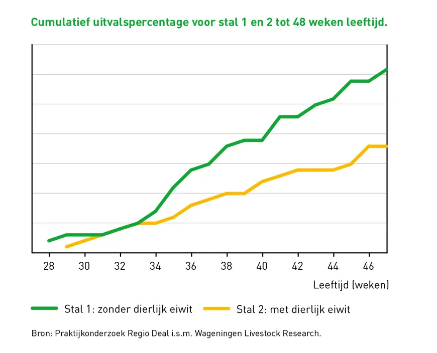 De kippen worden gehouden in twee identieke stallen met enkel een voerverschil: helemaal geen verwerkt dierlijk eiwit in de samenstelling (stal 1) of een hoog aandeel verwerkt dierlijk eiwit (stal 2). Het gaat hier om een proefstalopstelling waarbij de omstandigheden minder optimaal zijn dan in de praktijk. In de video laten we de twee verschillende groepen zien.