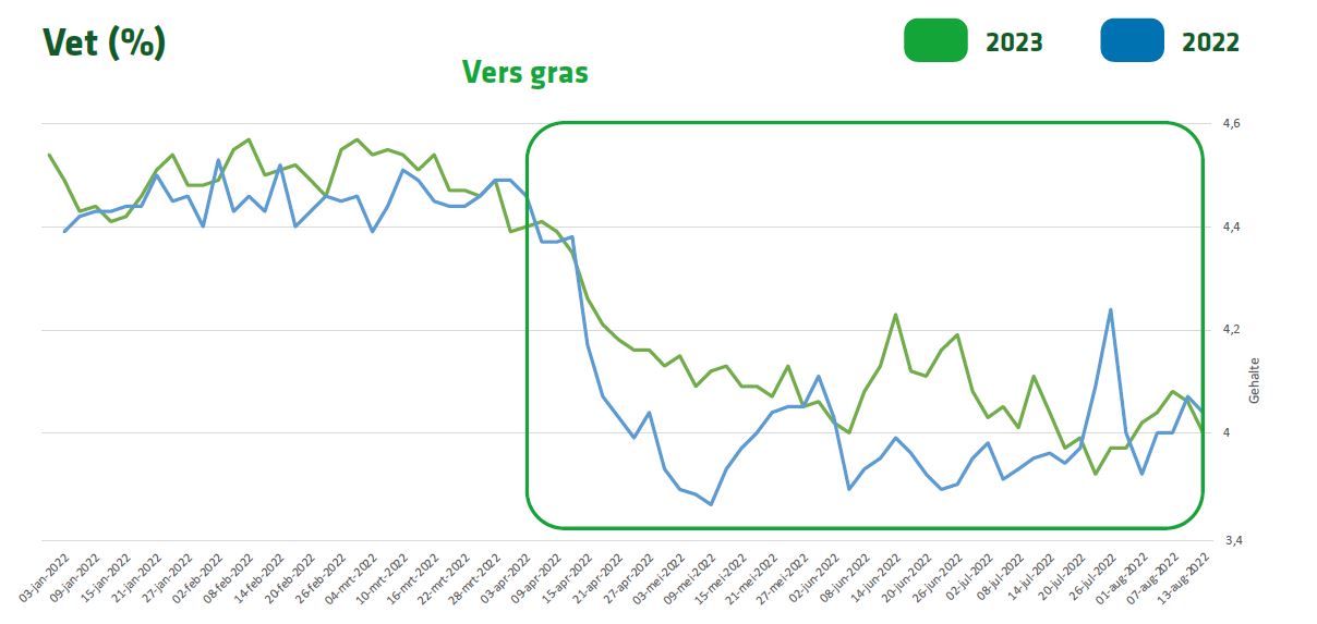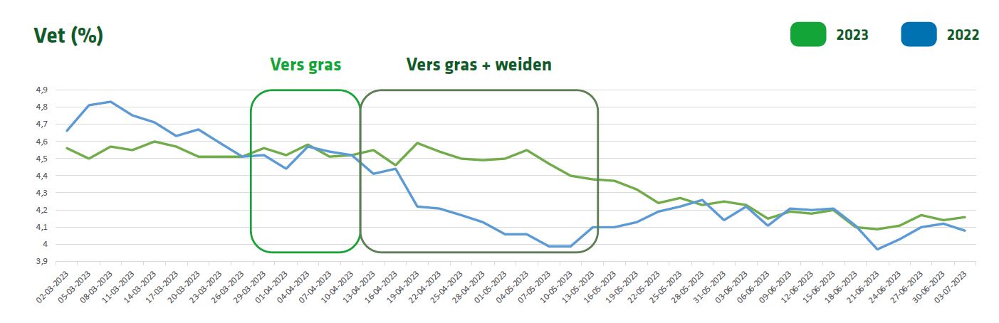 Bij de eerste dagen van de weidegang of tijdens het zomerstalvoeren neemt de melkproductie vaak toe, terwijl het aanbod lipogene (vetvormende) voedingsstoffen laag is. Azijnzuur en boterzuur zijn de belangrijkste lipogene voedingsstoffen voor de koe. Voorjaarsgras bevat vaak veel suiker en weinig ruwe celstof. Dat kan leiden tot een hoog pensfermentatieniveau. Dit zorgt voor een daling van de celwandfermentatie en een verlaging van azijnzuur in de pens. Het gevolg: een daling van het melkvetgehalte.