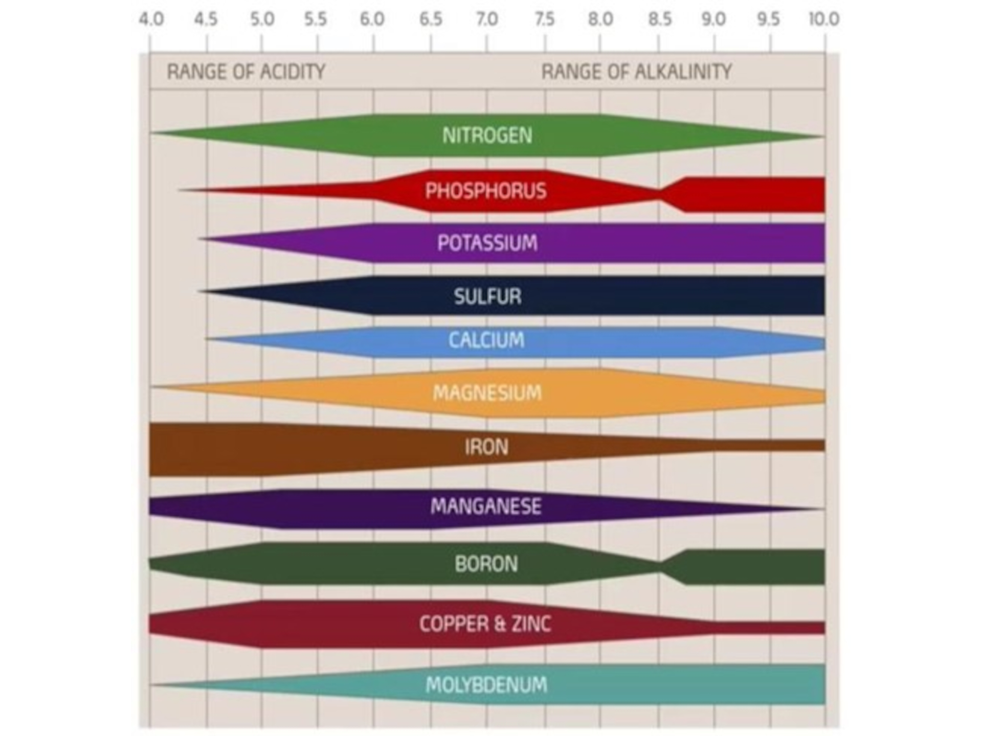 Een voorbeeld van een mineraal dat gevoelig is voor pH is fosfaat. Fosfaat wordt bij een te lage ph moelijker opneembaar uit de grond zoals te zien is in de tabel.