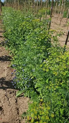 Bloemenstroken tussen de bomen zijn na de regen enorm snel gegroeid. Omdat we nu soms luis tegen komen, is het mogelijk om de bloemenstroken te klepelen, waardoor de natuurlijke vijanden vanuit de bloemenstroken het gewas ingaan. Door deze maatregel ligt de kwekerij er weer netjes bij en worden de aanwezige plaaginsecten goed opgeruimd om schoon de winter in te gaan. Om het helemaal goed te doen, is het beter om het klepelen in meerdere keren te doen. Zo blijven de schuilplekken zoveel mogelijk intact. Na het klepelen lopen de stroken weer uit en gaat het gewas met een beetje lengte de winter in. In het voorjaar heb je daardoor eerder bloeiende planten in het perceel die natuurlijke vijanden aantrekken.