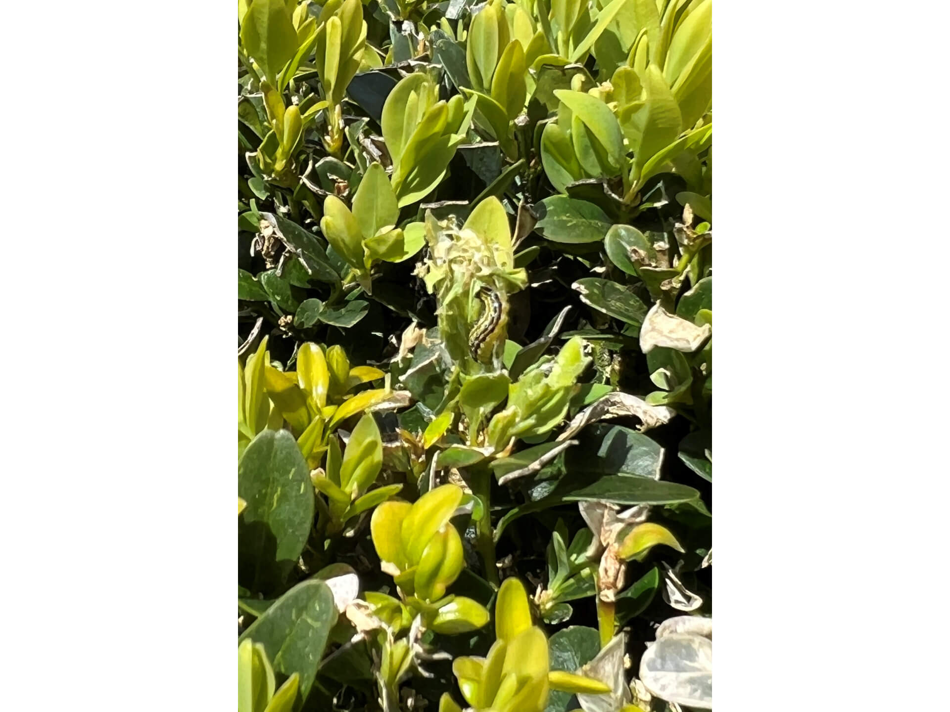 De rupsjes zijn nu ongeveer 2 cm groot en zien er uit als de groen met zwart gestreepte buxusrups. Als de temperatuur weer hoger wordt, dan zal de vraatschade snel groter worden.