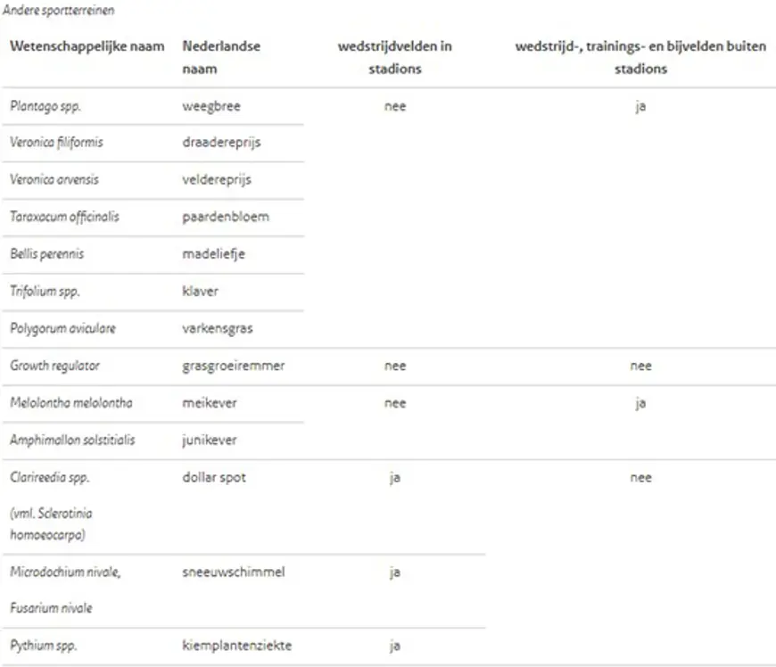 - Het verbod geldt niet in situaties waarbij de toepassing van een gewasbeschermingsmiddel plaatsvindt op specifieke terreinen voor recreatieve doeleinden, of voor het beoefenen van sport die vanwege hun aard of omvang redelijkerwijze niet op een andere wijze kunnen worden onderhouden.