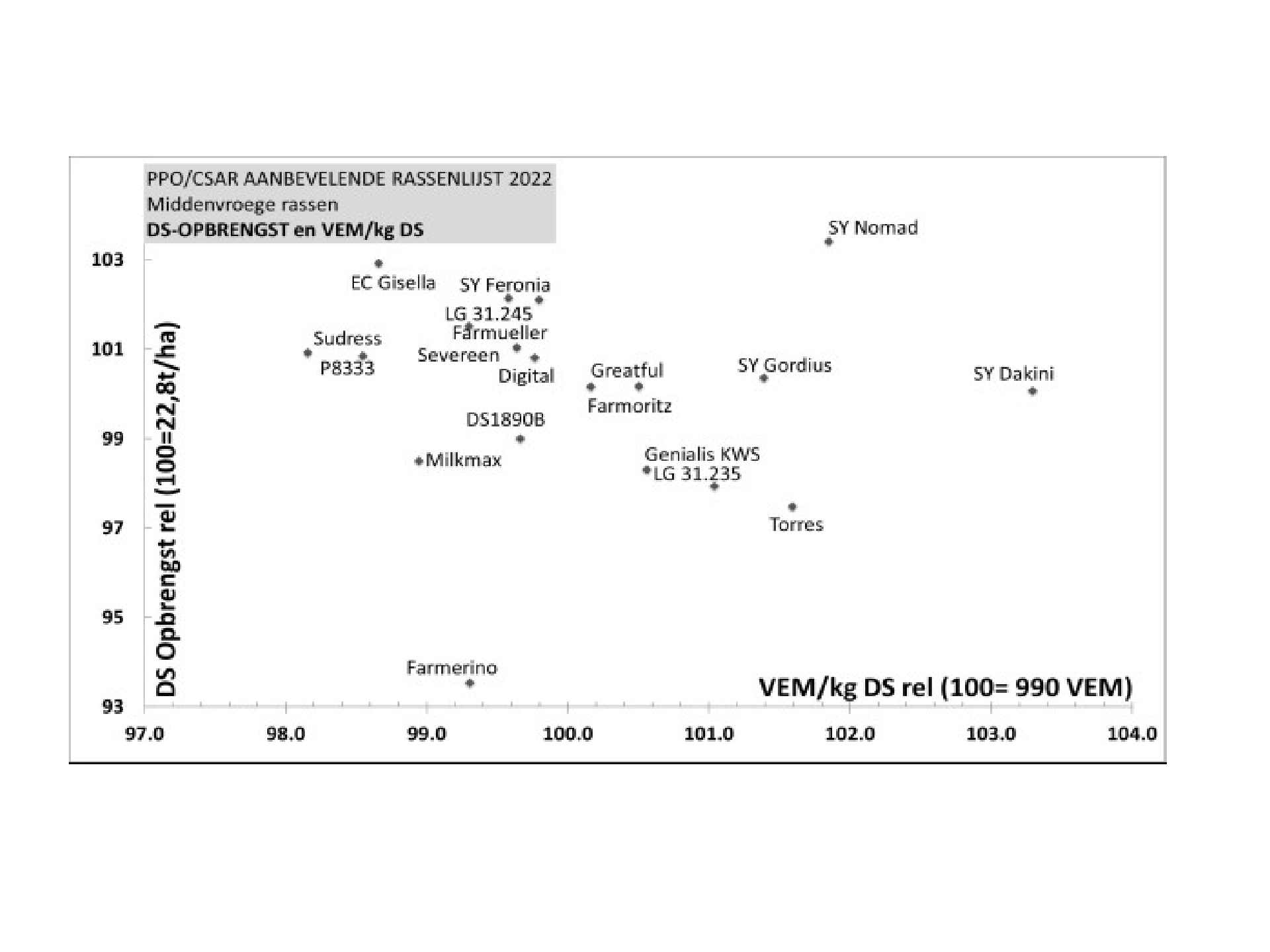 Voor drogestof-opbrengst heeft de SY Nomad het cijfer 102 gekregen. Voor VEM-opbrengst 103 en voor VEM per kg droge stof 102. Zie de grafiek hieronder.