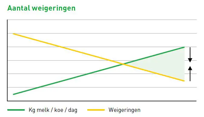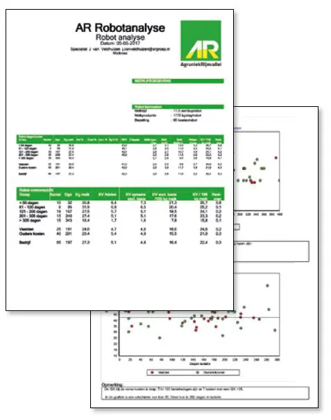 Het is raadzaam om regelmatig de AR robotanalyse uit te voeren. Hierdoor kunnen problemen op tijd gesignaleerd en verholpen worden. Bovendien voorkom je hiermee de kans op onnodige kosten. Jouw melkrobot levert veel gegevens over jouw koeien, maar de praktische vertaalslag ontbreekt vaak. AR voert de analyse uit op jouw bedrijf en de resultaten hiervan worden weergegeven in overzichtelijke tabellen en grafieken. Uiteraard is het ook belangrijk om de stal in te gaan en het rantsoen van de melkkoeien en droogstaande koeien grondig te bekijken. Op basis van alle bevindingen geven wij een passend advies.