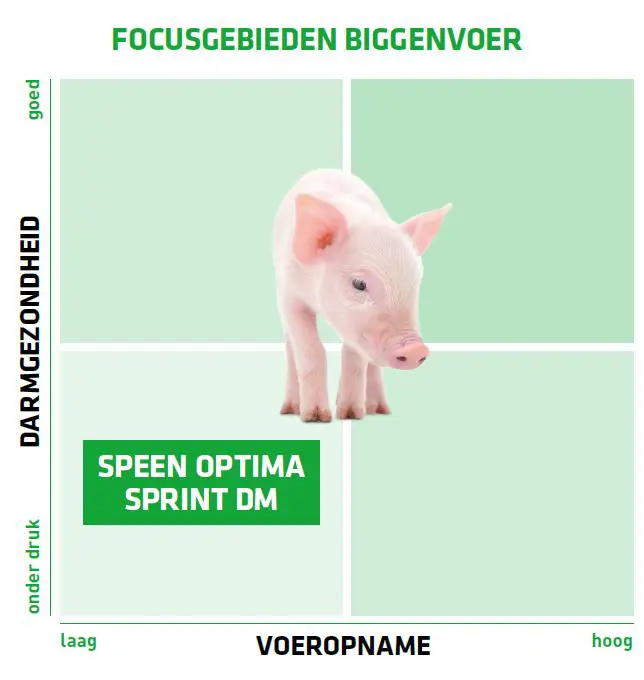 Speen Optima Sprint DM is speciaal geschikt voor biggen waar extra voeropname gewenst is en waar de darmgezondheid onder druk staat. Start een week voor spenen met het verstrekken van Speen Optima Sprint DM. Een week na spenen kan overgeschakeld worden op een babybiggenvoer.