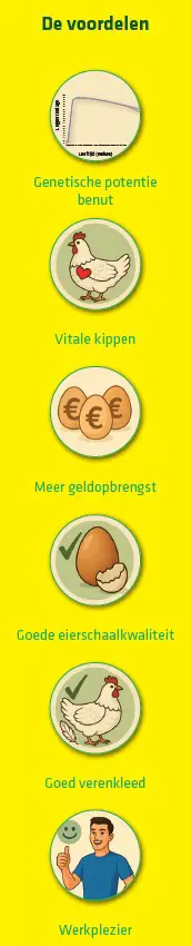 Deze nieuwe lijn is gebaseerd op een heldere visie: niet langer alleen sturen op leeftijd, maar op wat je ziet in de stal en terugziet in de data. Doordat de voeders nauw aansluiten bij de behoefte van hen kan de potentie van de leghen benut worden. De hennen blijven zo langer vitaal en productief.