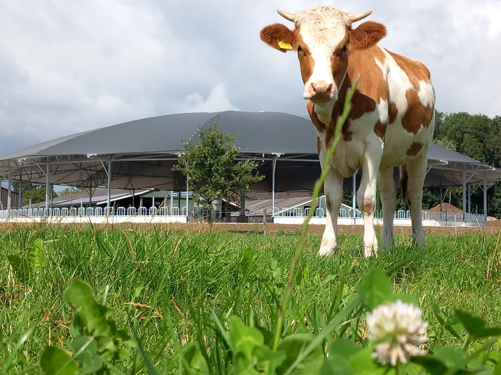 Het bedrijf van Koen en Wendy telt 120 koeien (Holstein ingekruist met Fleckvieh voor een wat robuustere koe), 60 stuks jongvee voor eigen opfok en ruim 100 hectare gras. Aan de weg staat een melktap. Wendy: “Deze vullen we elke dag en er wordt veel gebruik van gemaakt. Het is mooi om te zien dat mensen er blij van worden.” De koeien worden met twee melkrobots gemolken en de gehaltes liggen rond de 3,30% eiwit, 4,40% vet bij 7.200 liter per koe. Dit is het derde seizoen dat de koeien volledig weidegang krijgen. Koen: “Dit past zo goed bij ons. Drie jaar geleden is een kavelruil gerealiseerd. Door de aaneengesloten percelen kunnen de koeien 24 uur per dag buiten lopen. Pas in het najaar gaan de koeien weer naar binnen.”