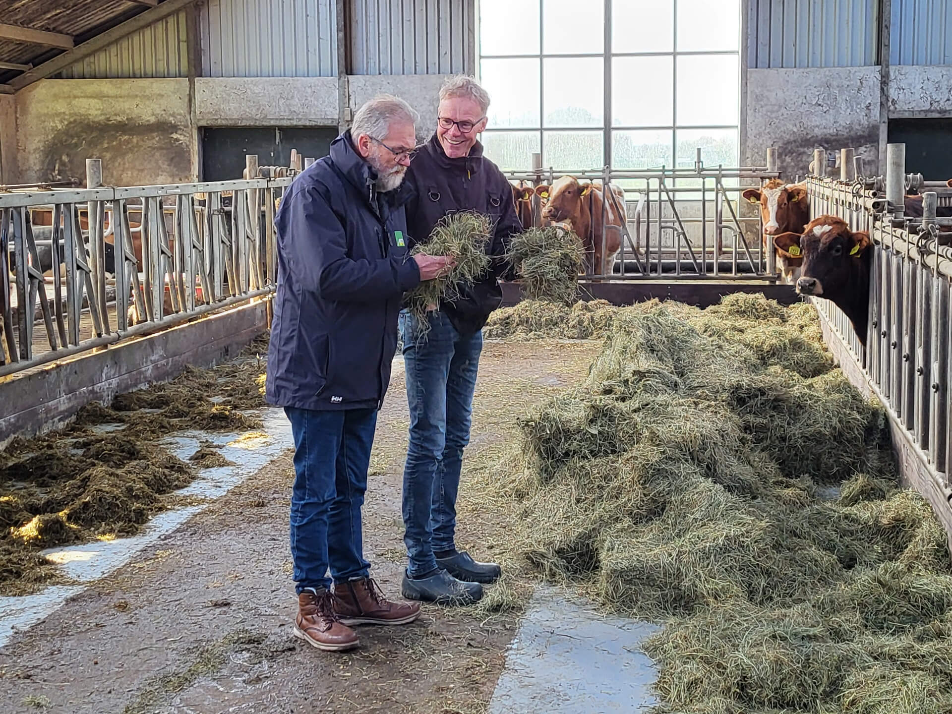 Met hun 40 hectare cultuurgrond (waarvan 6,5 hectare mais) en 20 hectare natuurgrond met landbouwkundige functie, zorgen ze ervoor dat het voer grotendeels van eigen land komt. Naast mais en gras voeren ze hun koeien het hele jaar door bierbostel als bijproduct, ook als de koeien in de zomer buiten lopen. Arjo is erg fan van de Productiebrok Lipo Turbo, dat is de hoofdbrok van de koeien. “De glucogene nutriënten in de brok zijn heel belangrijk, om de energie goed op peil te houden”, zegt Henk. De mineralen worden meegemengd in de brok. Ze voeren dus geen losse componenten aan het voerhek. Als het nodig is sturen ze energie bij met de Mengbrok Mais/Tarwe.