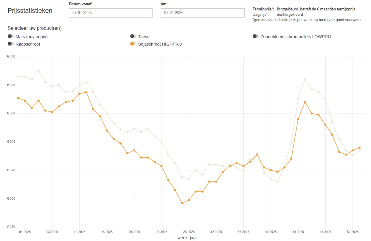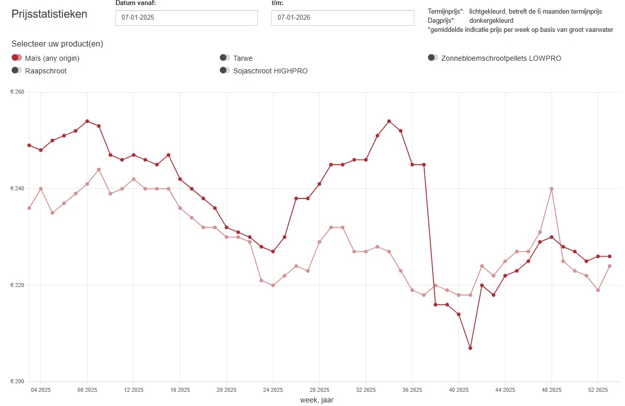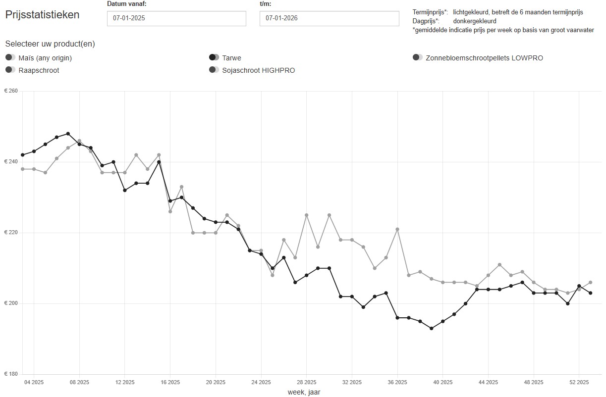 In onderstaande grafieken worden er per grondstof twee prijzen weergegeven. Dit zijn de dagprijs en de termijnprijs (zes maanden). De termijnprijs is de notering van de grondstof die gekocht wordt in de aangegeven week voor levering zes maanden later. Klik op de grafiek om hem te vergroten.